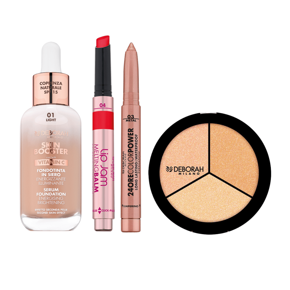 Dopraj svojej pleti zjednotený, svieži a jemne rozžiarenejší vzhľad s touto výhodnou sadou bestsellerov značky Deborah Milano. V jednom balíčku nájdeš všetko, čo potrebuješ na rýchle a spoľahlivé líčenie – od ľahkého zjednotenia pleti, cez jemné rozjasnenie až po praktické očné líčenie a šťavnaté pery.