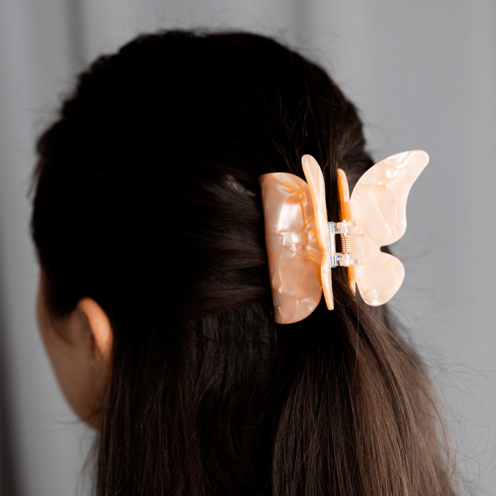 Štýlový škripec v tvare motýlika v jemnej broskyňovej farbe s perleťovým efektom. Praktický doplnok, ktorý tvojim vlasom dodá šmrnc a zároveň ich spoľahlivo udrží na mieste.